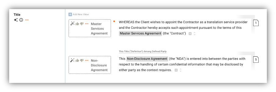There are various reports where select contract sentences are presented as relevant to a particular concept. Prior to this release, it was not always obvious where these sentences had come from, nor whether they were contained in a single provision, or spread out across many pages. By adding new page context markers, it is now easy to see where in the contract each sentence was found. If, for example, a contract title was found on page 1, and another contract title was found on page 5, a reviewer may quickly conclude that the page 1 title is the correct one.
